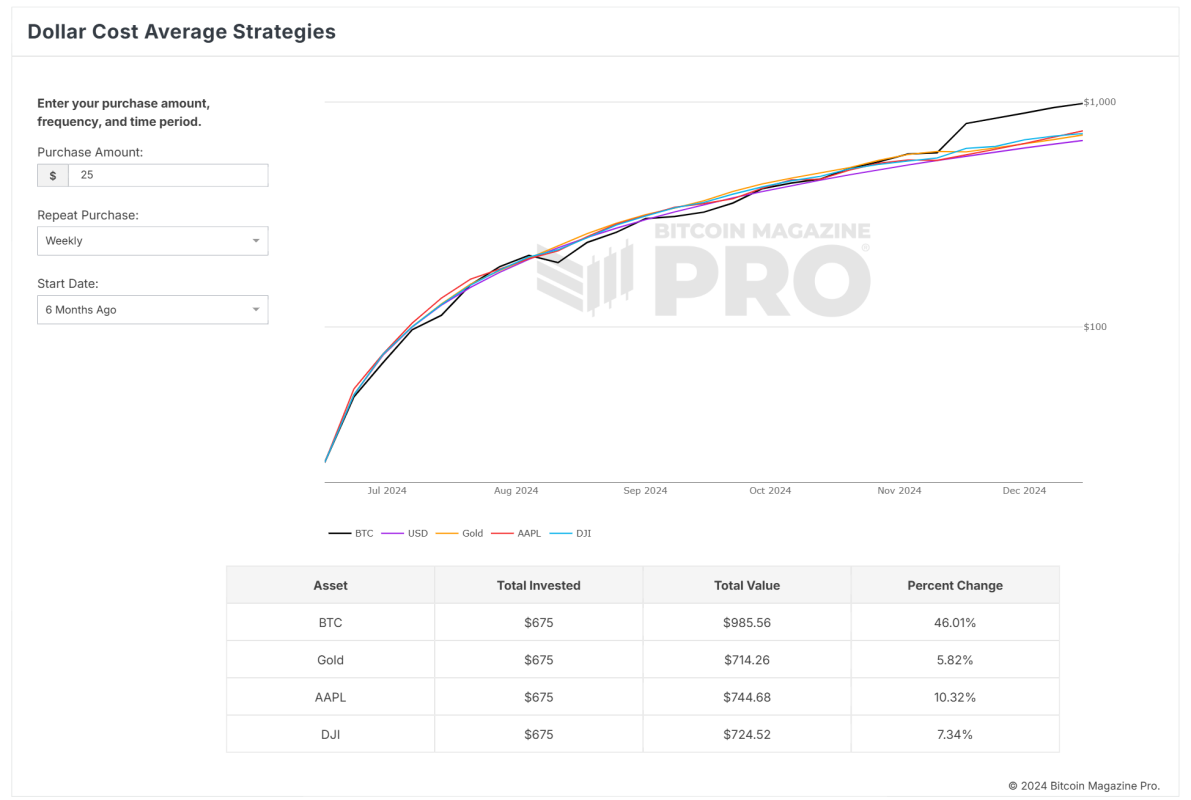 Bitcoin Magazine Pro has a free portfolio analysis tool, Dollar Cost Average (DCA) Strategies, which enables investors to measure Bitcoin’s performance against other leading assets like gold, the Dow Jones (DJI), and Apple (AAPL) stock. This powerful tool provides hard data to demonstrate how consistent, disciplined investing over time can lead to outsized returns, even with modest amounts.