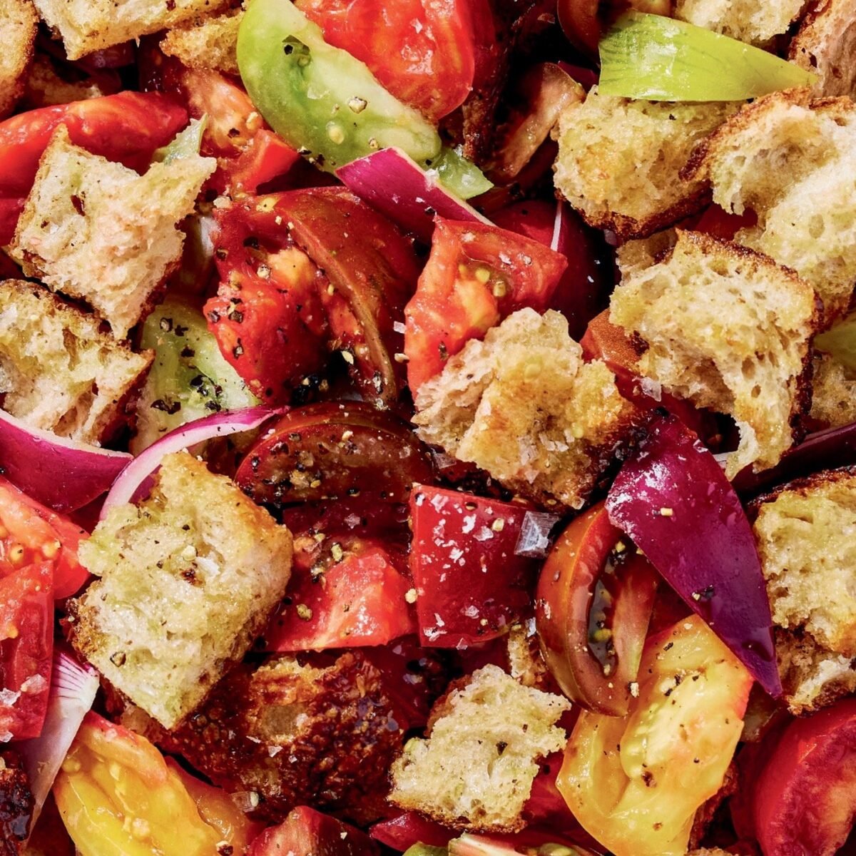 Says Dan: “I’ve always said panzanella salad is just a bread basket in drag. It’s the same satisfying taste of ripping apart a dinner roll and running it through vinegary oil but dressed up for the evening gown portion of the night. This salad began as Tuscan peasant food, a very smart way to get an extra meal out of stale loaves. Now you’ll find it with luxury accessories like cheese, stone fruits, or all kinds of proteins. When the tomatoes mingle with onions, red wine vinegar, oil, and plenty of salt and pepper, you’ve got everything you need in the world.”