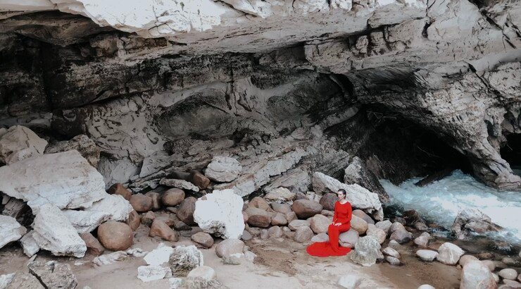 A woman in a long red dress in a rocky area.
