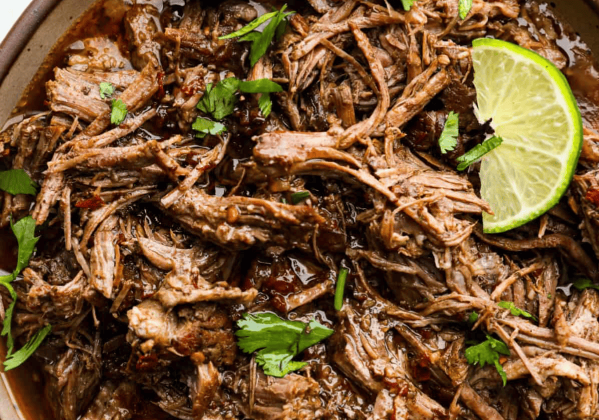 Bowl of slow cooker Barbacoa beef garnished with cilantro and lime.