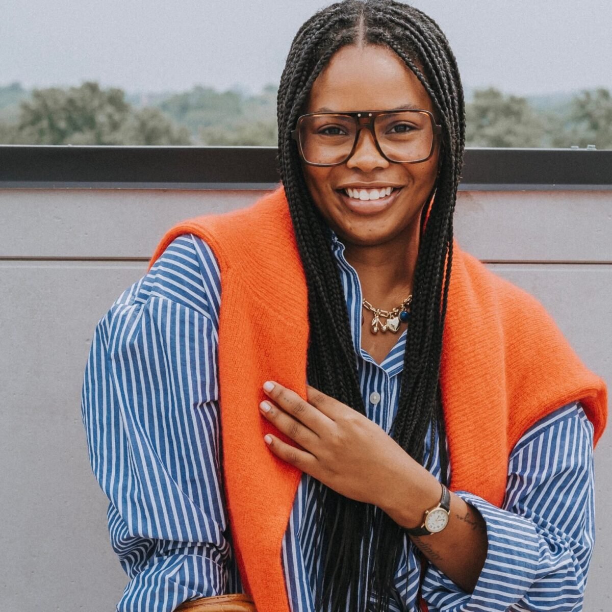 Shirt: Everlane. Sweater: ASOS. Jeans: Madewell. Glasses: Jimmy Fairly. Watch: “hand-me-down from my mom.” Purse: vintage.