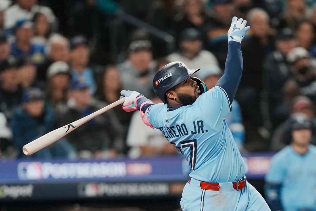 Oct 16, 2025; Seattle, Washington, USA; Toronto Blue Jays first baseman Vladimir Guerrero Jr. (27) hits a solo home run against the Seattle Mariners in the seventh inning during game four of the ALCS round for the 2025 MLB playoffs at T-Mobile Park. Mandatory Credit: Stephen Brashear-Imagn Images SEATTLE — Max Scherzer pitched 5 2/3 innings for his first postseason victory since 2019 as the Toronto Blue Jays evened the American League Championship Series by defeating the Seattle Mariners 8-2 in Game 4 on Thursday.