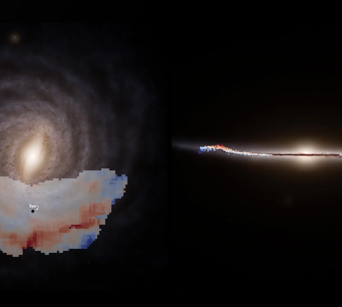 In the image on the left, we see our galaxy from a top-down perspective. The right panel shows a side view, cutting vertically through the galactic plane. From this angle, the left portion of the galaxy curves upward while the right side bends downward (this is the warp of the disc). The red and blue regions mark the newly discovered wave: red areas indicate stars located above the warped plane, while blue areas show stars lying below it.