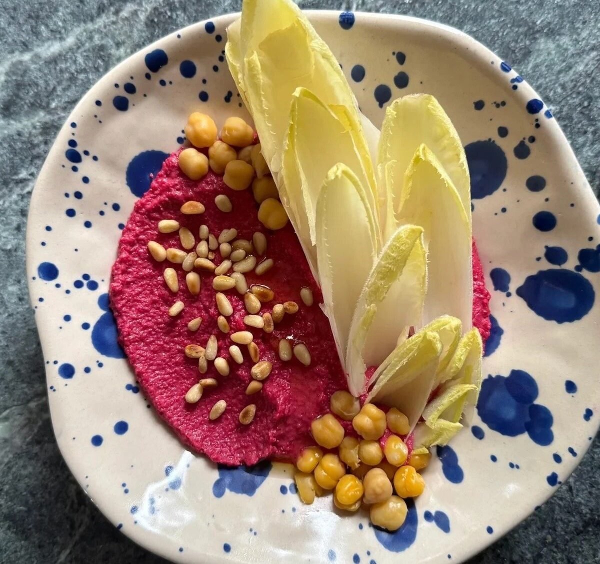 Serve, if you’d like, with pan-toasted pine nuts and the reserved chickpeas on top. For dipping, I find it goes best with endives and carrots.