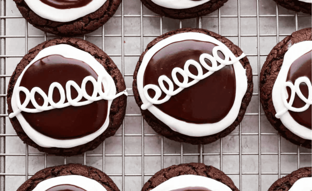 These Hostess Cupcake Cookies take your favorite childhood treat and turn it into soft, chocolate cookies! They are topped with sweet marshmallow and smooth chocolate ganache, and of course, the classic white swirl!