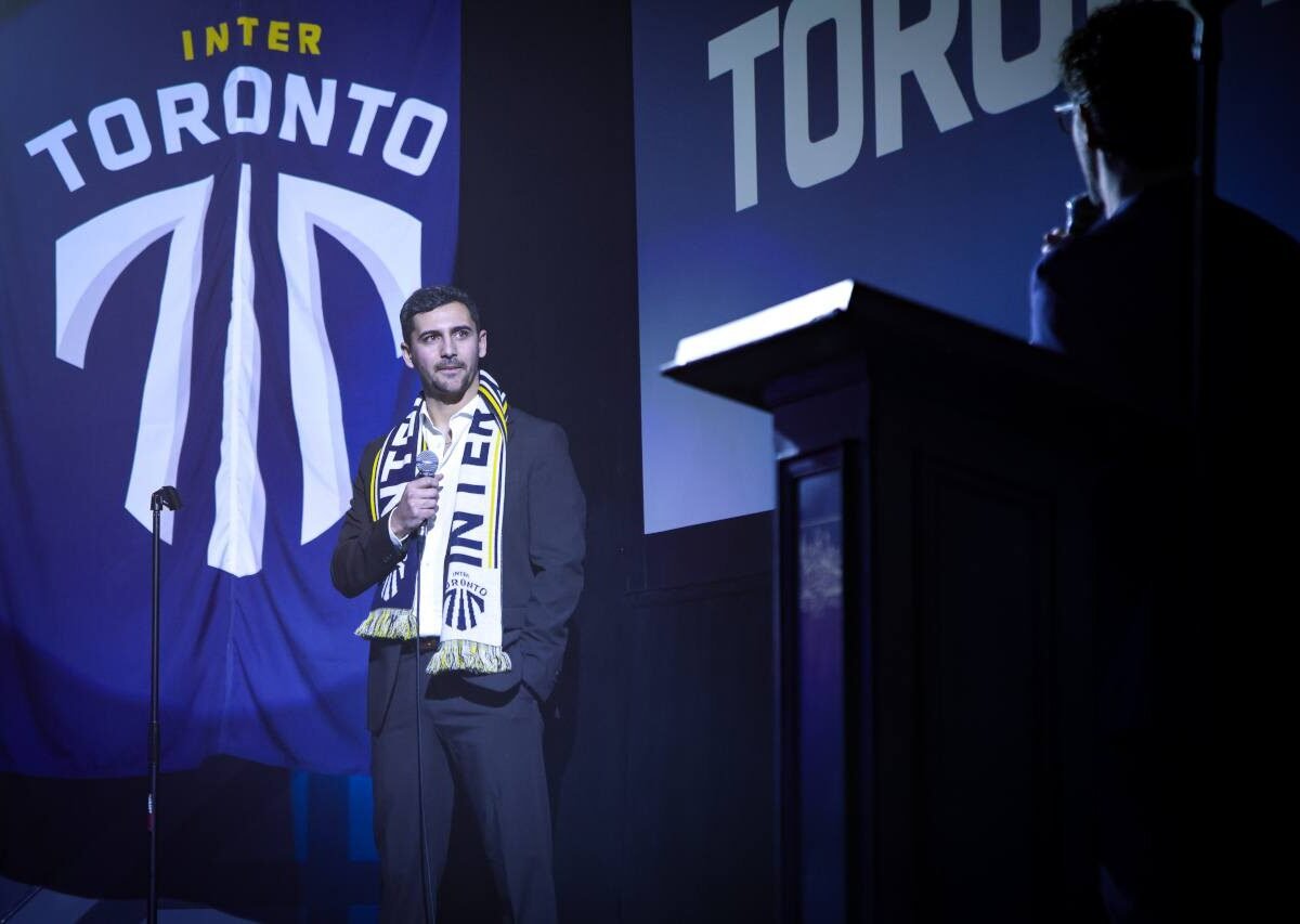 Inter Toronto coach Mauro Eustaquio gives a statement during the Inter Toronto Football Club launch event last week. IFC was announced as the new identity of the Canadian Premier League’s Toronto-based club. Photo by Indrawan Kumala/NurPhoto via Getty Images
