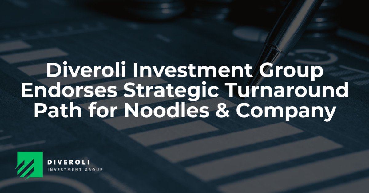 Diveroli Investment Group (“DIG”), a significant shareholder of Noodles & Company, today announced the filing of its Schedule 13D with the SEC. DIG’s investment thesis aligns with Noodle’s strategic review already underway, and the firm is pleased to see management, alongside Piper Sandler, examining pathways and levers frequently utilized in successful sector turnarounds.