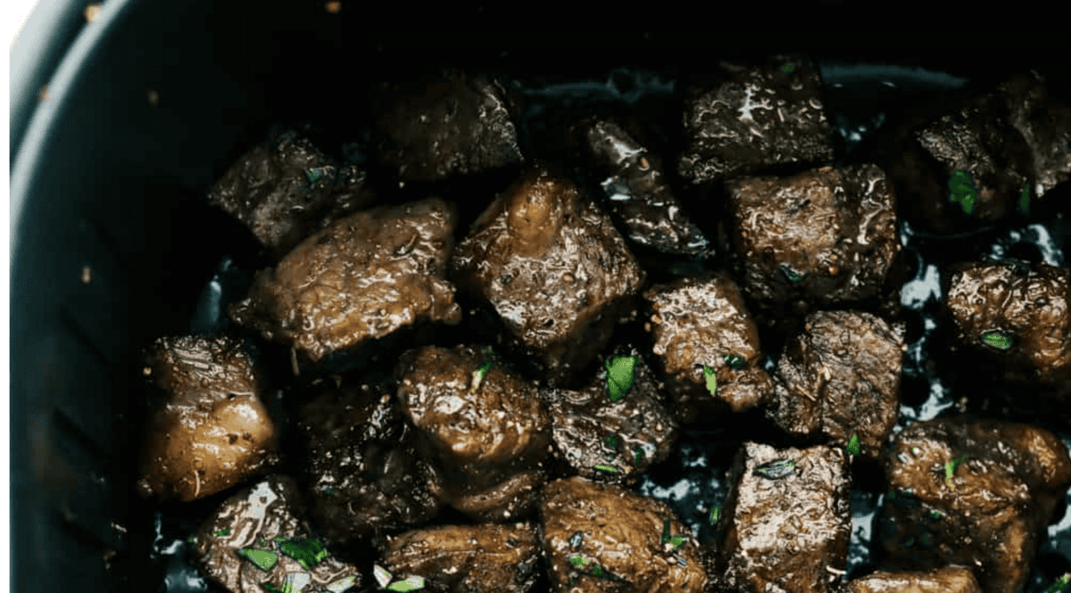 A close up of garlic steak bites in the air fryer. A close up of garlic steak bites in the air fryer.