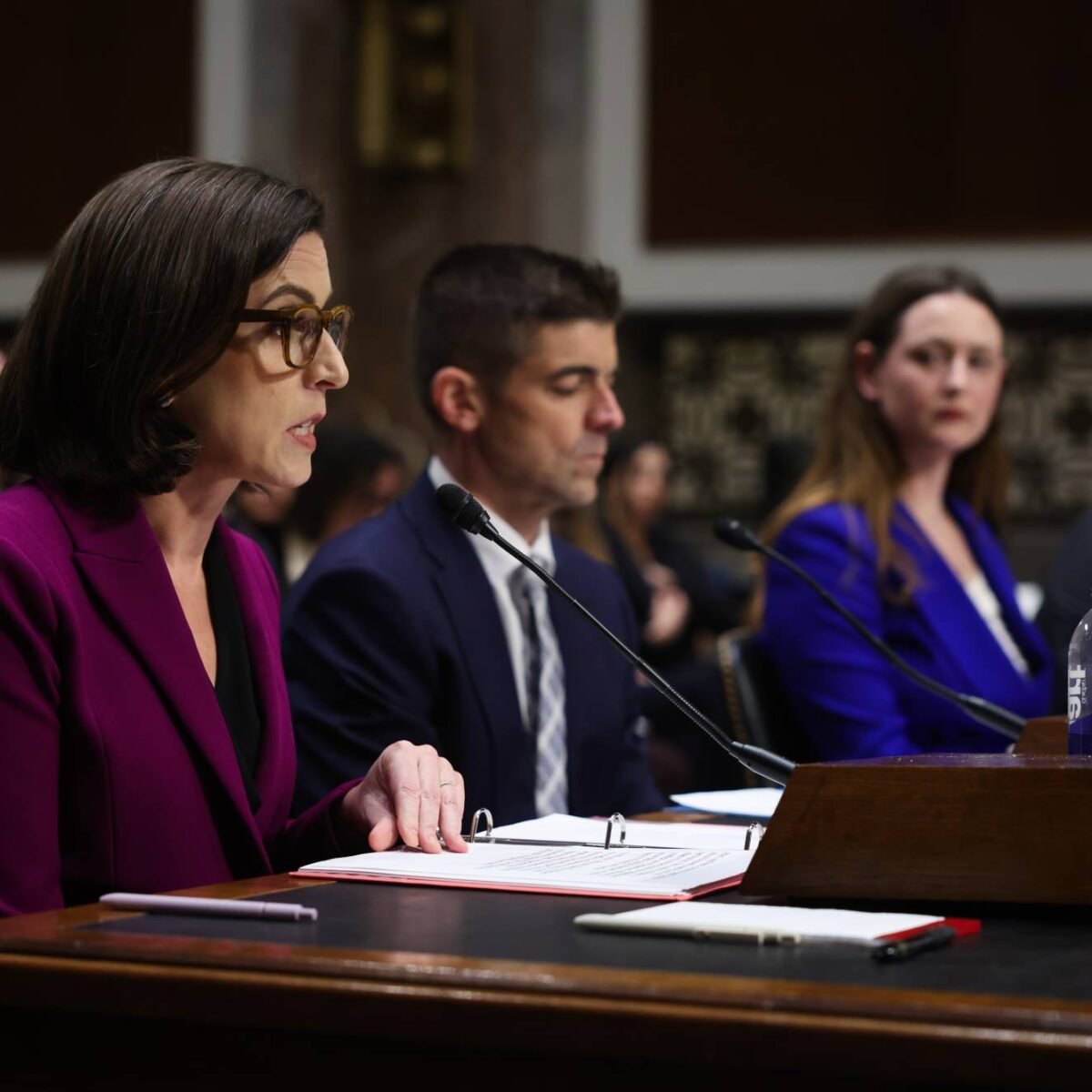 Liz Oyer (left), a former U.S. pardon attorney who reviewed and investigated applications for executive clemency, speaks alongside Ryan Crosswell, Rachel Cohen and Stacey Young during a bicameral hearing on the U.S. Justice Department in the Dirksen Senate Building on April 7, 2025 in Washington, DC. (Kayla Bartkowski/Getty Images)