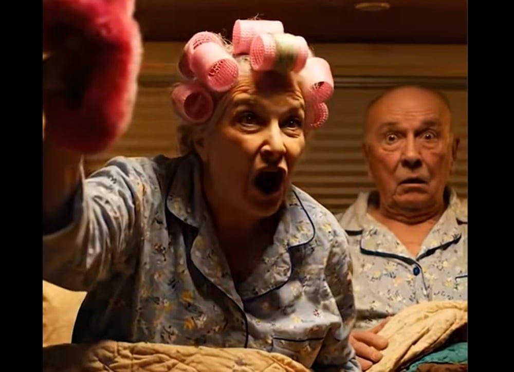 Cut to an elderly couple in bed. The woman, her hair wrapped in bright pink curlers, screams, “Get out of my trailer!”