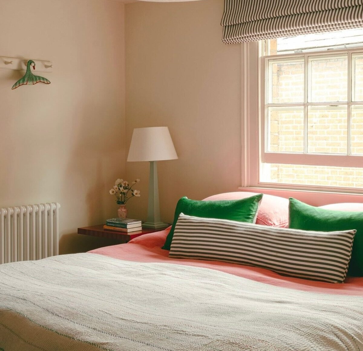 My friend just moved into a sixth floor walk-up, and her small bedroom is sunny and bright but painted in that old landlord white. She asked me for color suggestions, and I’m thinking a creamy pink? I love my own bedroom color — feels like a womb — and pictured above is Harriet Slaughter’s bedroom in Lime White. What bedroom colors do you like?