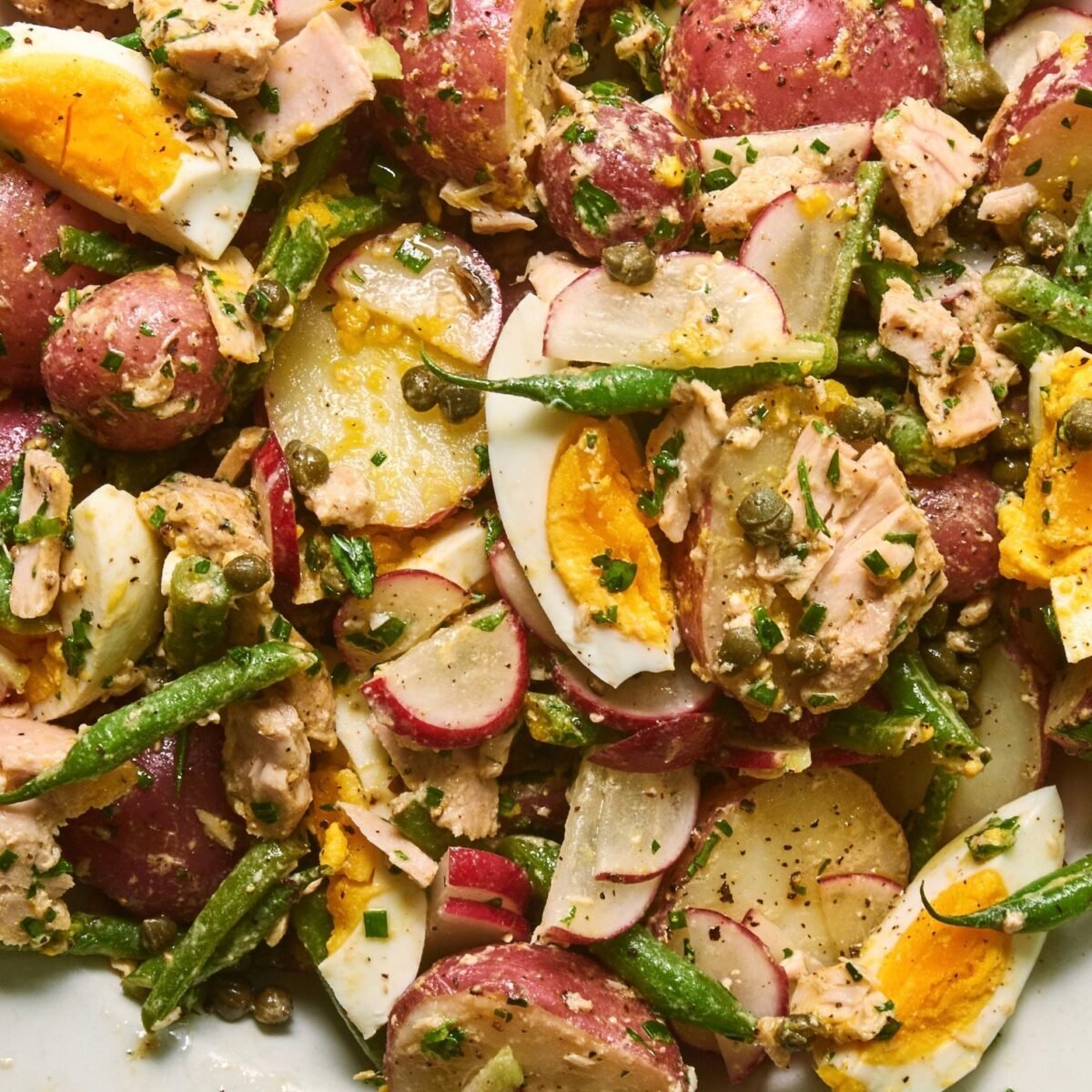 Blanch the green beans in the potato water for 30 seconds to 1 minute — just long enough for them to turn bright green. Strain, and add to the potatoes. Add the tuna, flaking the fish into the bowl, followed by the radishes and chives. Toss to incorporate, then add the eggs and lemon juice. (Note: “If you’re making this a day or more in advance, hold the lemon juice and add it just before serving,” says Melina. “Otherwise, it will dull the color of the green beans.”) Gently toss once more. “I like to use a silicone spatula and work up from the bottom of the bowl, folding the ingredients together with a light hand so the yolks remain mostly intact.”
