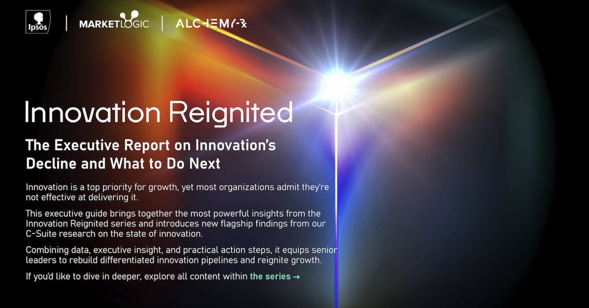 A new study, Innovation Reignited: C-Suite insights on the state of innovation, from Ipsos, Alchemy-RX and Market Logic reveals that innovation is rapidly becoming the cornerstone of corporate growth strategies worldwide. According to the findings of the survey of C-Suite executives, 82% of companies expect innovation to drive growth strategy. Still, only the most ambitious leaders (33%) anticipate this will account for more than 20% of revenue in the next three years.