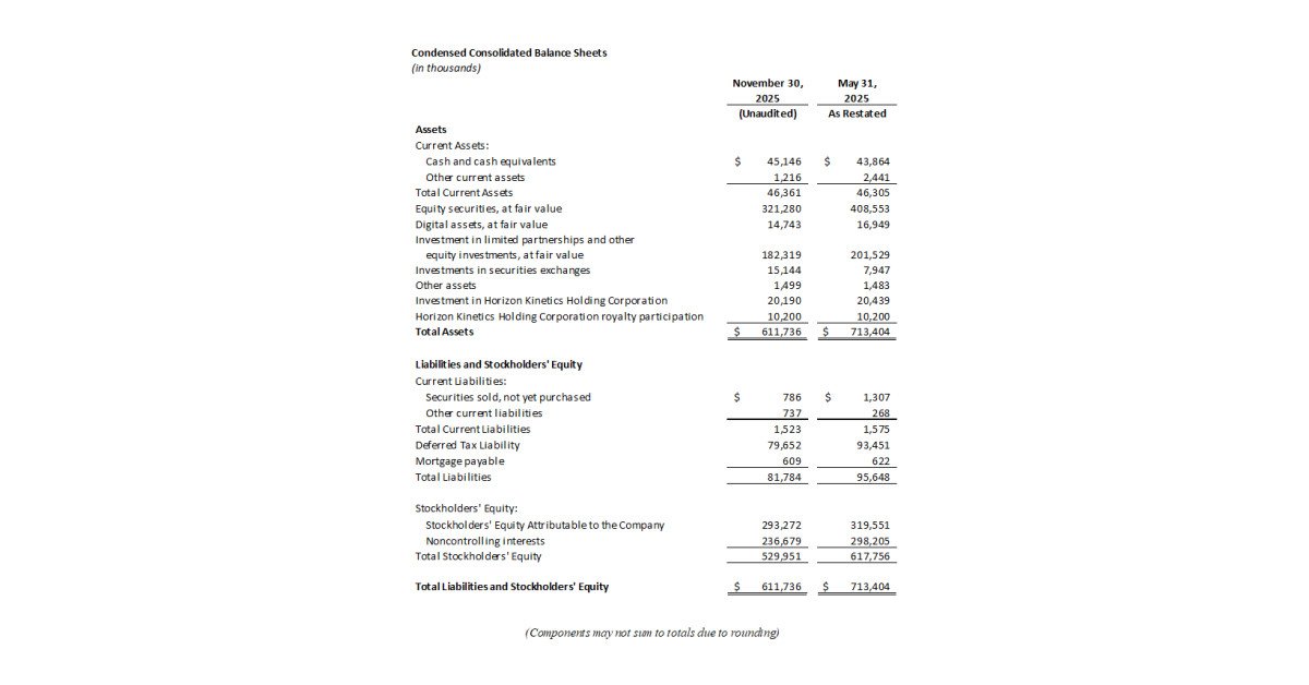 Current assets, comprised primarily of cash and cash equivalents, amounted to $46.4 million as of November 30, 2025, and $46.3 million as of May 31, 2025. Total liabilities were $81.8 million as of November 30, 2025, and $95.6 million as of May 31, 2025 (as restated), comprised primarily of deferred taxes and securities sold, not yet purchased.