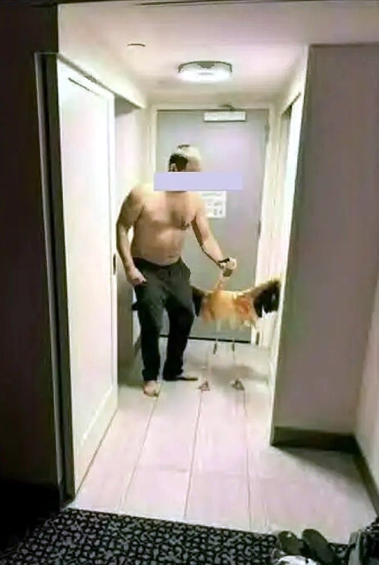Fairbarn is shown carrying Peachy the flamingo to his hotel room. on the 14th floor. (Image: Las Vegas Justice Court)