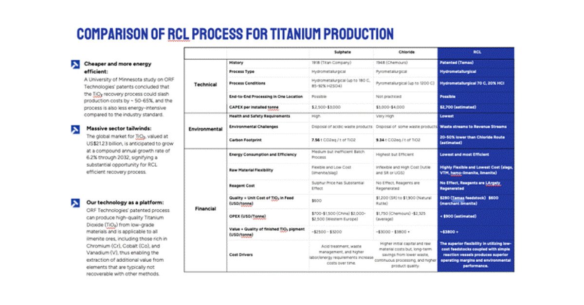 Environmental Performance: The closed-loop design and high reagent recycling rates are core to the RCL platform, irrespective of the target mineral. Over 69% lower operating costs compared to conventional processing due to its core features operating at near ambient temperatures.3 This means the reduced environmental footprint and enhanced ESG profile are benefits that extend to ores and minerals previously noted, not just TiO2.