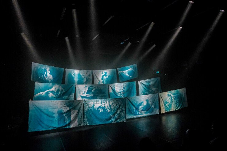 A set of sheets with projections onstage.