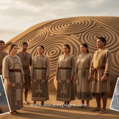 Three people standing on a stone stairway.
