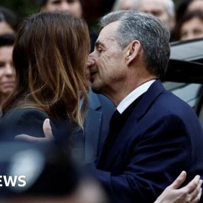 Paul KirbyEurope digital editor and Hugh Schofieldin Paris Reuters Sarkozy kissed his wife Carla Bruni-Sarkozy as he left his home for jail, surrounded by supporters