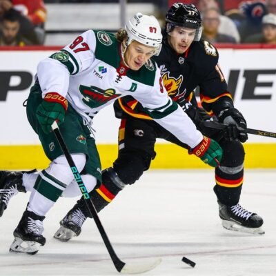 Dec 4, 2025; Calgary, Alberta, CAN; Minnesota Wild left wing Kirill Kaprizov (97) and Calgary Flames center Yegor Sharangovich (17) battle for the puck during
