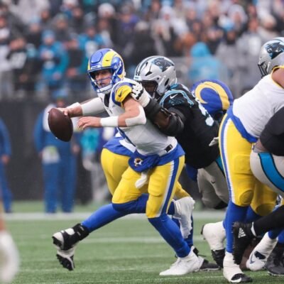 Nov 30, 2025; Charlotte, North Carolina, USA; Los Angeles Rams quarterback Matthew Stafford (9) is sacked by Carolina Panthers defensive end Derrick Brown (95) during