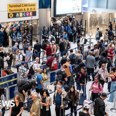 Getty Images Travellers wait in a long line at a security checkpoint at Houston’s George Bush Intercontinental Airport on 6 November More than 1,400 flights