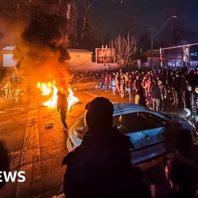 Helen Sullivan,BBC Newsand Soroush Negahdari & Roja Asadi,BBC News Persian Reuters Burning vehicles were pictured in Tehran on Friday night As protests in Iran continue